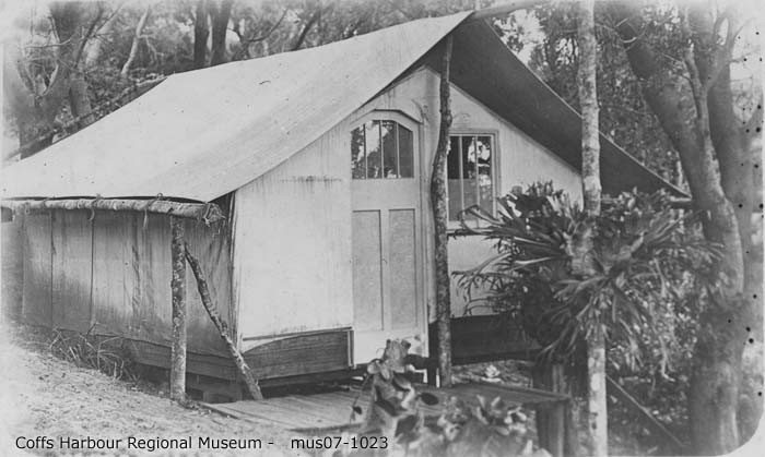 "On Coff’s Harbour Creek I found two selectors clearing the scrub and ringbarking the king trees of the forest. One of them, named James Marles, an engineer by trade, invited me to dine with him and his comely wife. Their domicile was a calico tent, and their household goods and chattels few in number, but if ever I saw cheerfulness and contentment, combined with extreme hope as to the future, it was under their humble roof."